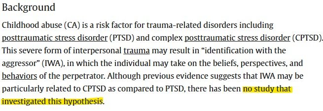 I read an article recently, and I could have told them all about IWA (Identification With the Aggressor) had they just asked. I recognized this behavior as a trauma-related response 20+ years ago. I want to award the No Shit Sherlock Award to these scientists for their achievements emerging from under whatever rock they were living under to conduct the most obvious study. Congratulations.
